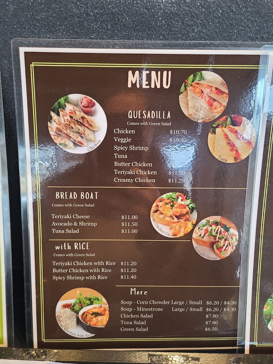 Quesadillas are available with several fillings including Chicken, Veggie, Spicy Shrimp, Tuna, Butter Chicken, Teriyaki Chicken, and Creamy Chicken, with prices ranging approximately from CA$10.40 to CA$11.20. These items provide a range of savory choices suitable for a light meal or snack.